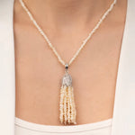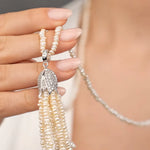 Pearlora ustalarının özenle dizdiği inciler, püskül formunda buluşarak hareket ettikçe ışıldar. Işığın her adımınızda dans ettiği bu kolye, girdiğiniz her ortamda tüm dikkatleri üzerinize çekecek.