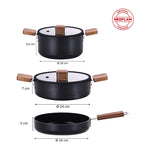 Set, 3 adet pişirme kabı (Tava, Sığ Tencere, Derin Tencere) ve bu kaplardan ikisine ait 2 adet cam kapaktan oluşmaktadır.
